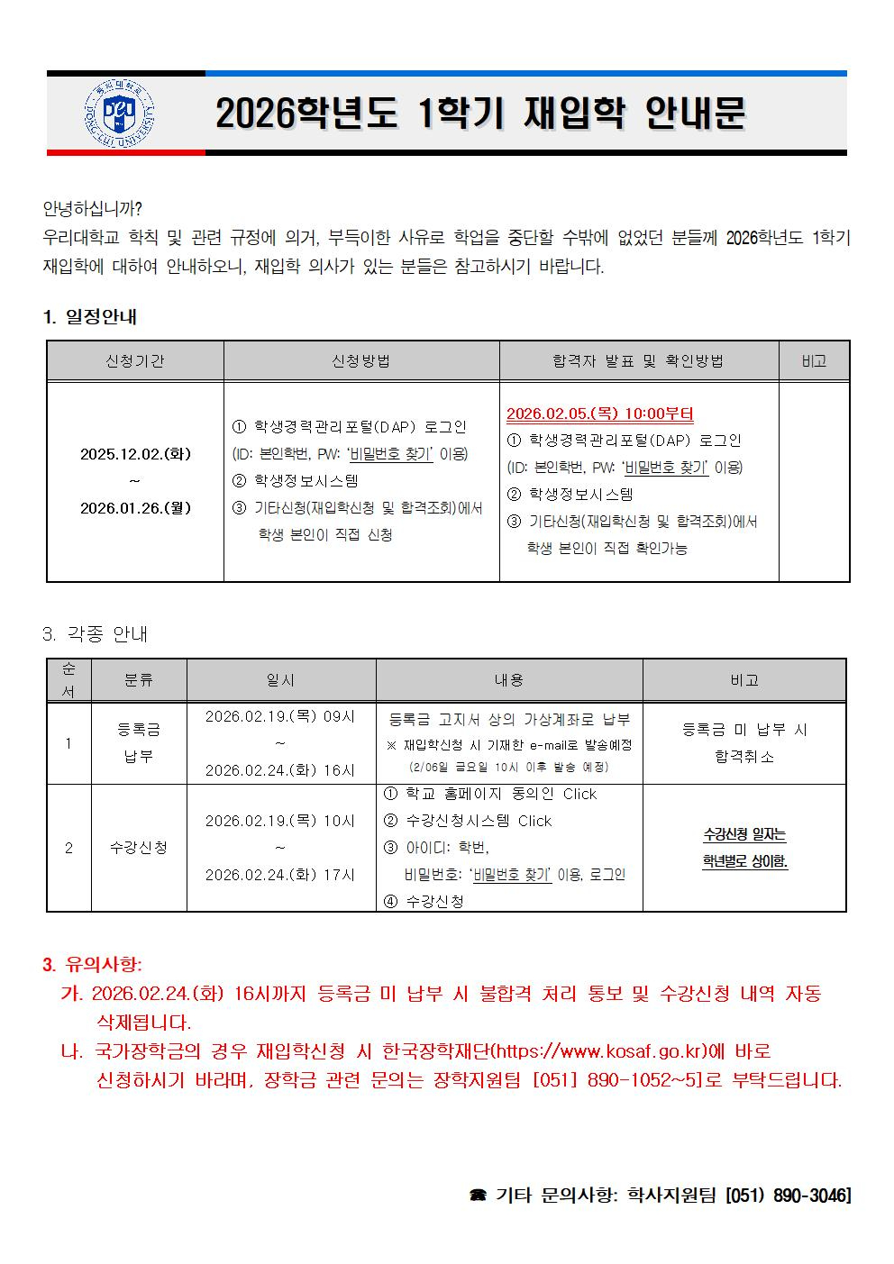 2026학년도 1학기 재입학 안내(2025. 12. 02.시작)